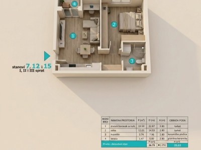 Kuca kvalitetne gradnje, u mirnom delu naselja. U osnovi 113m2 /podrum, prizemlje, potkrovlje/. Prizemlje se sastoji od dnevnog boravka sa izdvojenom kuhinjom, dve spavace sobe, vesernice, kupatila i prelepe terase. Na podovima je parket, razvedeno grejanje, postavljena nova PVC stolarija sa roletnama i komarnicima. Spoljne stepenice za potkrovlje koje se sastoji od velikog dnevnog boravka, spavace sobe i kupatila. U dvoristu je uknjizena, zidana garaza povrsine 24m2.