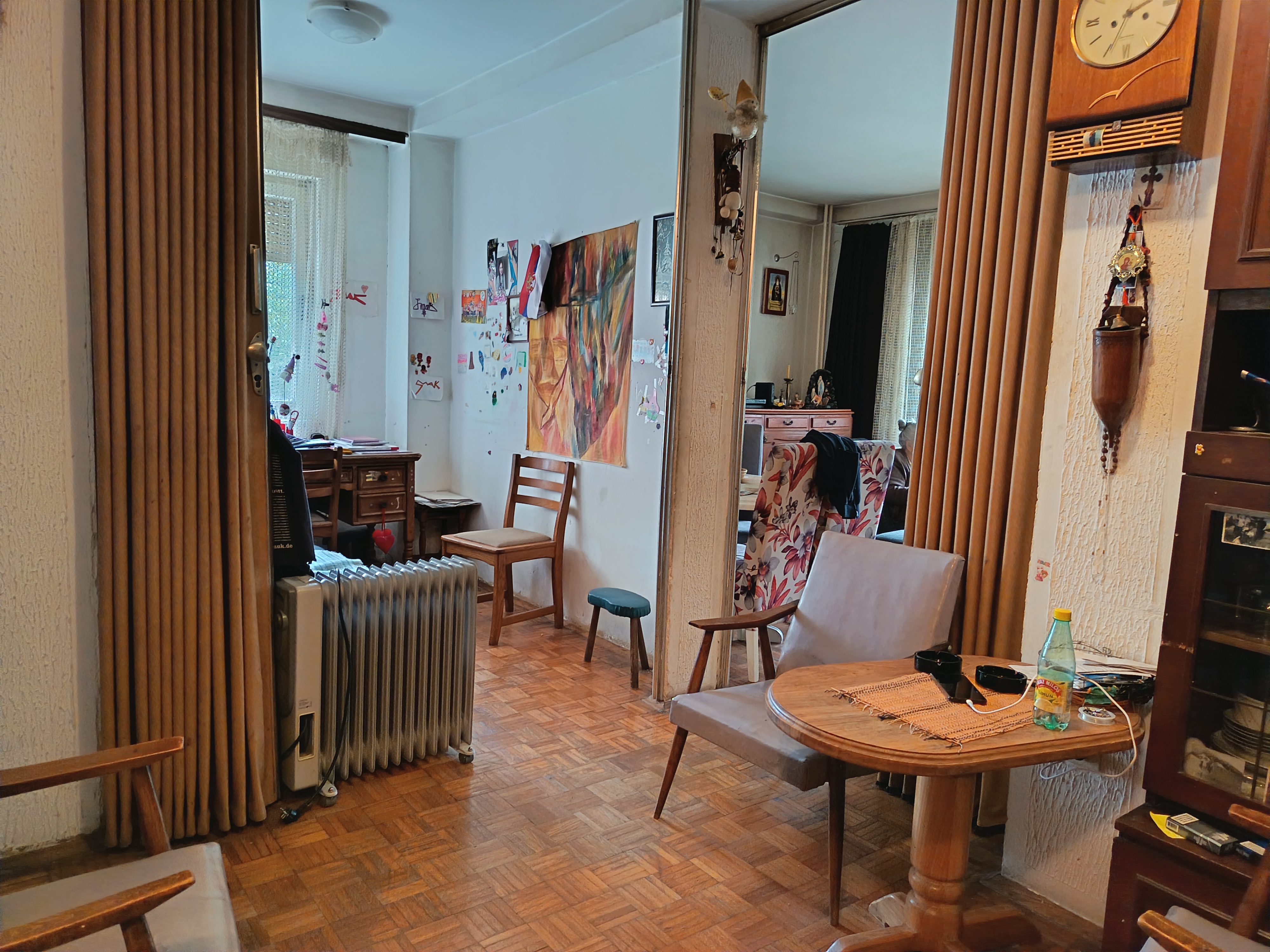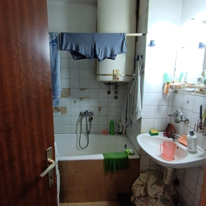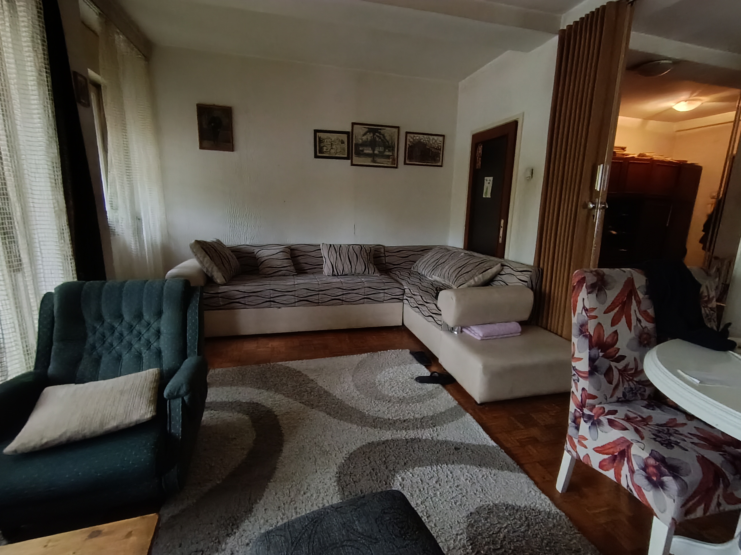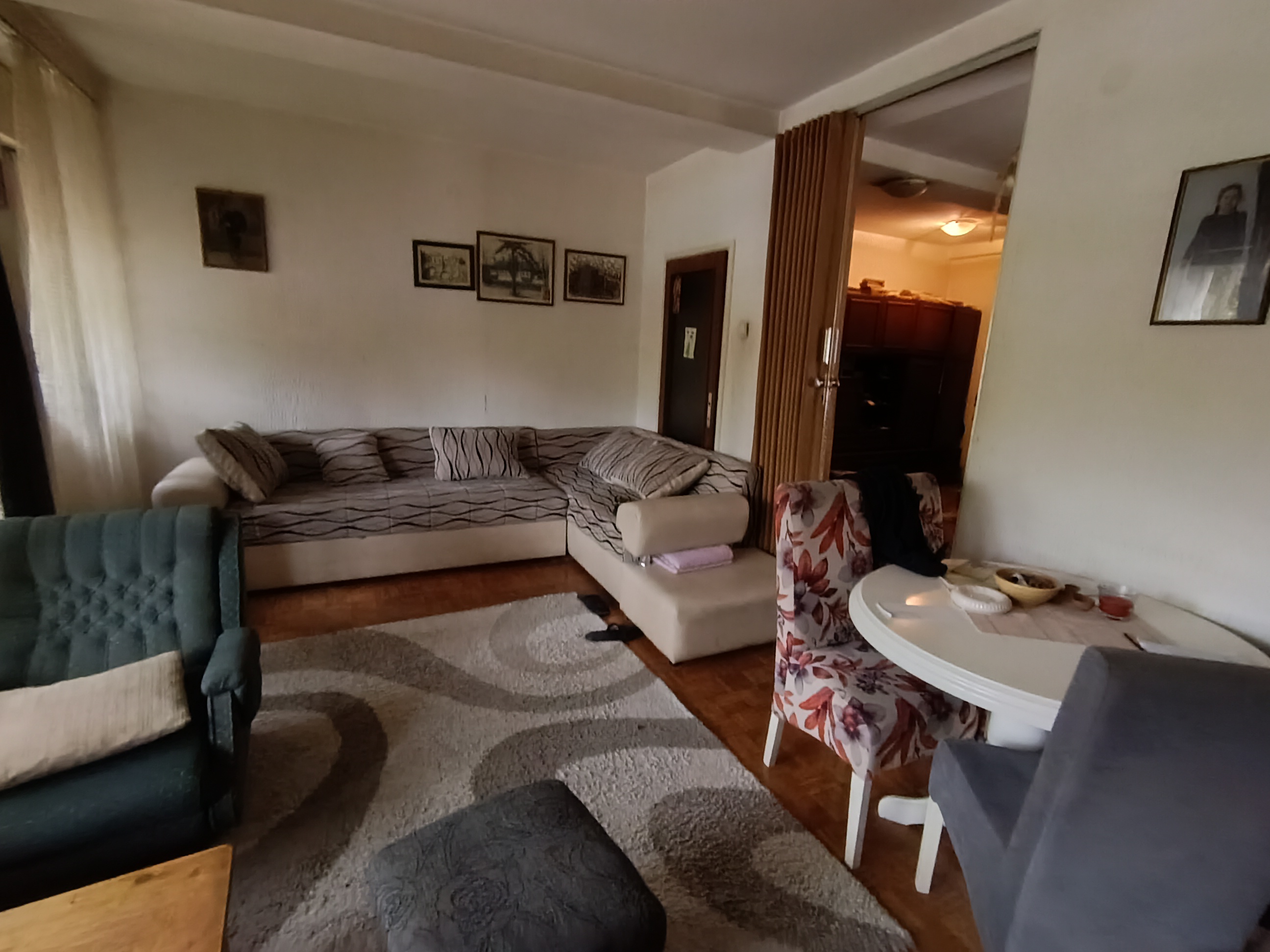 Stan se nalazi u donjem delu naselja, izuzetna lokacija. Istocno orjentisan. Sastoji se od dnevnog boravka iz kog se izlazi na veliku terasu, kuhinje koja ima izlaz na lodju, spavace sobe, decje sobe, kupatila i hodnika. Pripadajuci podrum. U izvornom stanju. Zgrada je uredjena, kao i prostor oko zgrade. Veliki parking.